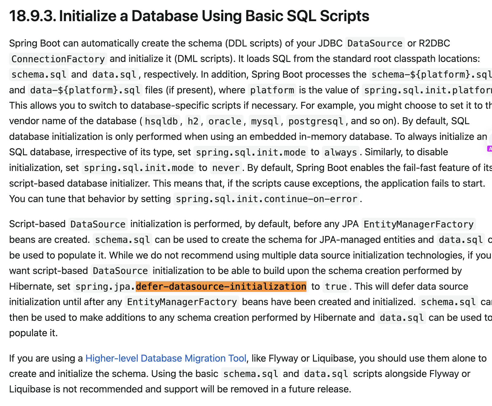 번역을 해석해 보자면 기본적으로 Spring Boot는 JPA EntityManagerFactory 빈이 생성된 이전에 데이터베이스 초기화를 수행합니다. 하지만 만약 spring.jpa.defer-datasource-initialization 속성을 true로 설정하면 데이터 소스 초기화가 EntityManagerFactory 빈 생성 이후에 실행되어 만약 하이버네이트 초기화로 생성된 스키마를 수정하거나, 데이터를 채우고 싶다면 spring.jpa.defer-datasource-initialization을 true로 주어야 한다고 합니다.