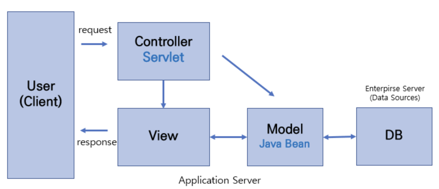 JSP와 같은 뷰 기술과 Servlet과 같은 컨트롤러 기술을 사용하되, 모델을 담당하는 컴포넌트를 추가하여 뷰와 컨트롤러를 분리한다. (MVC1과는 다르게 Controller, View가 분리되어 있다.)
