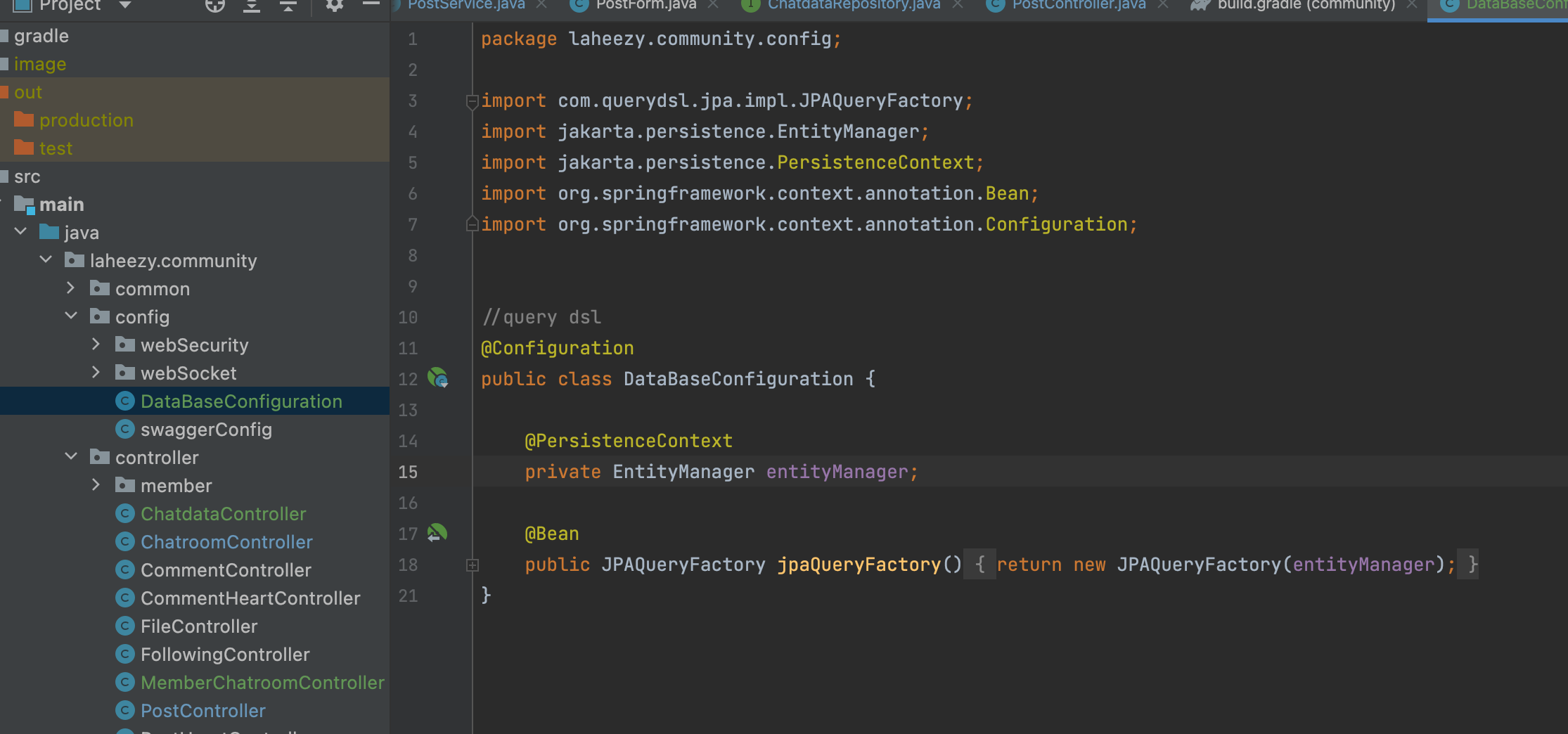 JPAQueryFactory는 Querydsl을 사용하여 JPA를 통해 데이터베이스와 상호작용하기 위한 도구로 EntityManager를 기반으로 하여 동작하는것으로 위에서 생성된 bean이 주입됩니다.