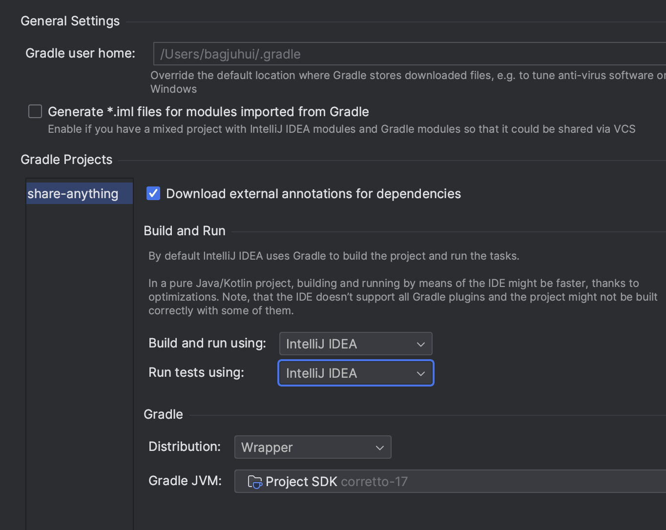 맥 기준 : intelliJ->setting -> build tools -> gradle : gradle -> intellj로 변경하였습니다. ( 빌드 환경 변경)